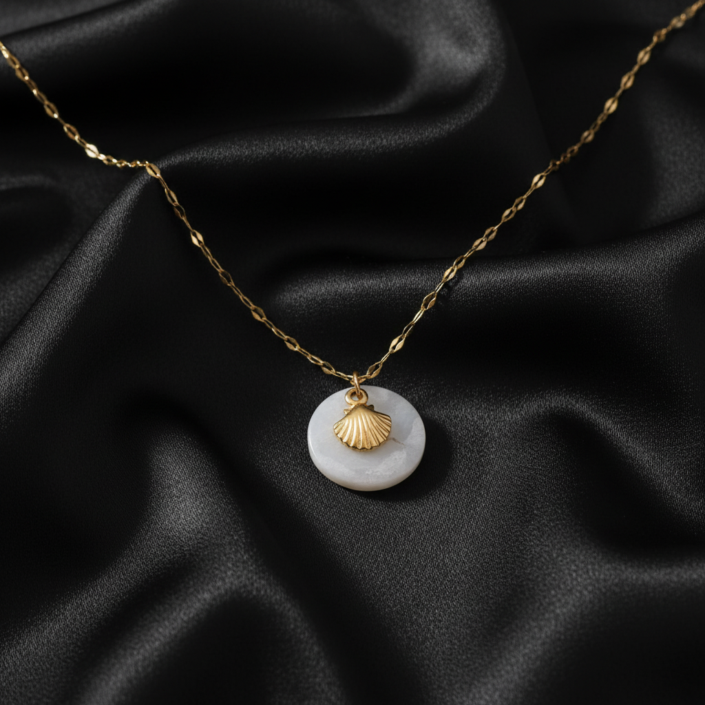 A soft and elegant necklace featuring a white shell pendant touched with gold. Its calm, ocean-inspired charm makes it a timeless piece simple, graceful, and effortlessly chic. Designed with an anti-tarnish finish to keep its glow lasting beautifully.