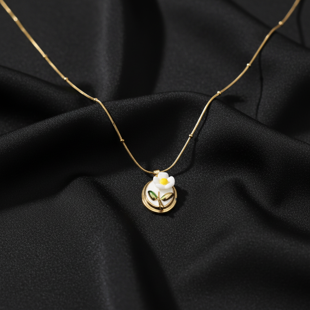 A graceful anti-tarnish pendant featuring a white flower with soft green leaves, set in a smooth round frame. Elegant, fresh, and perfect for adding a subtle floral touch to any outfit.