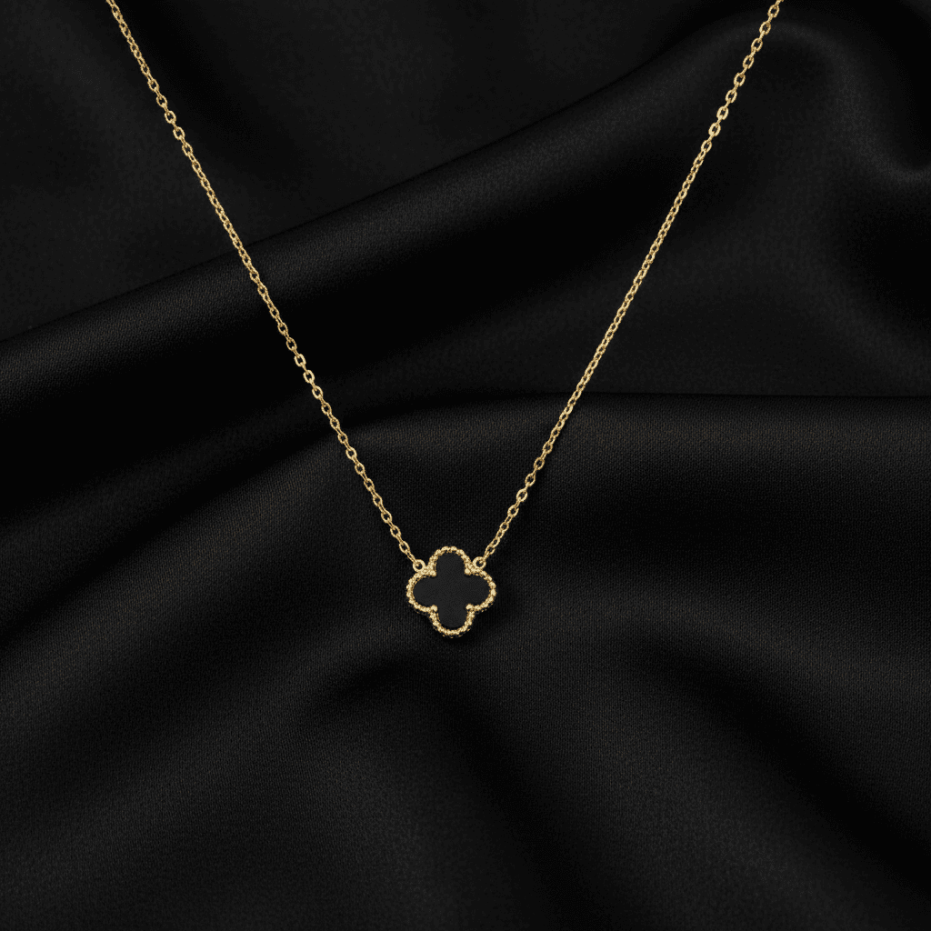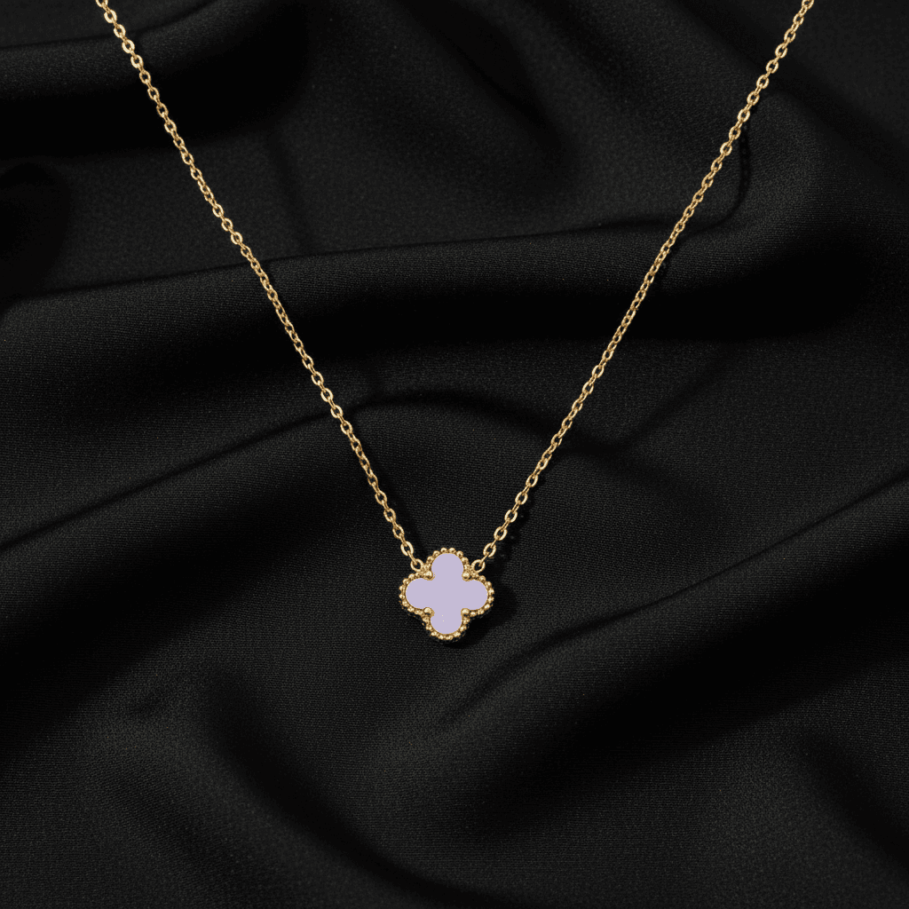 Delicate gold-tone chain featuring a timeless clover pendant with a soft ivory center and beaded border.