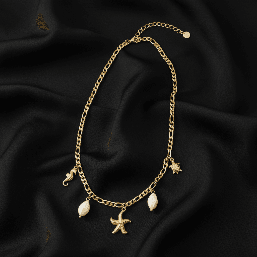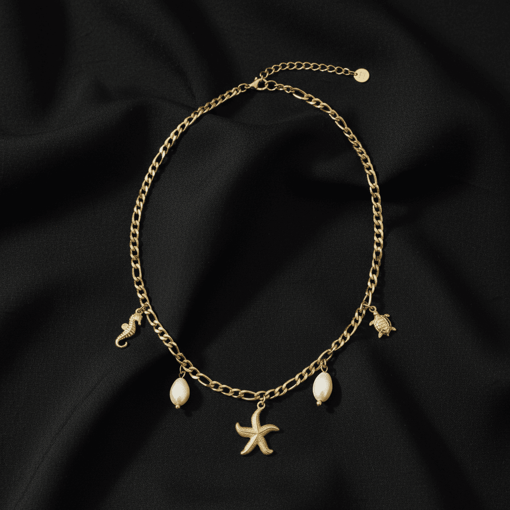 Bring beachside elegance to your look with the Coastal Charm necklace featuring delicate sea-inspired charms and pearls on a chunky anti-tarnish chain.