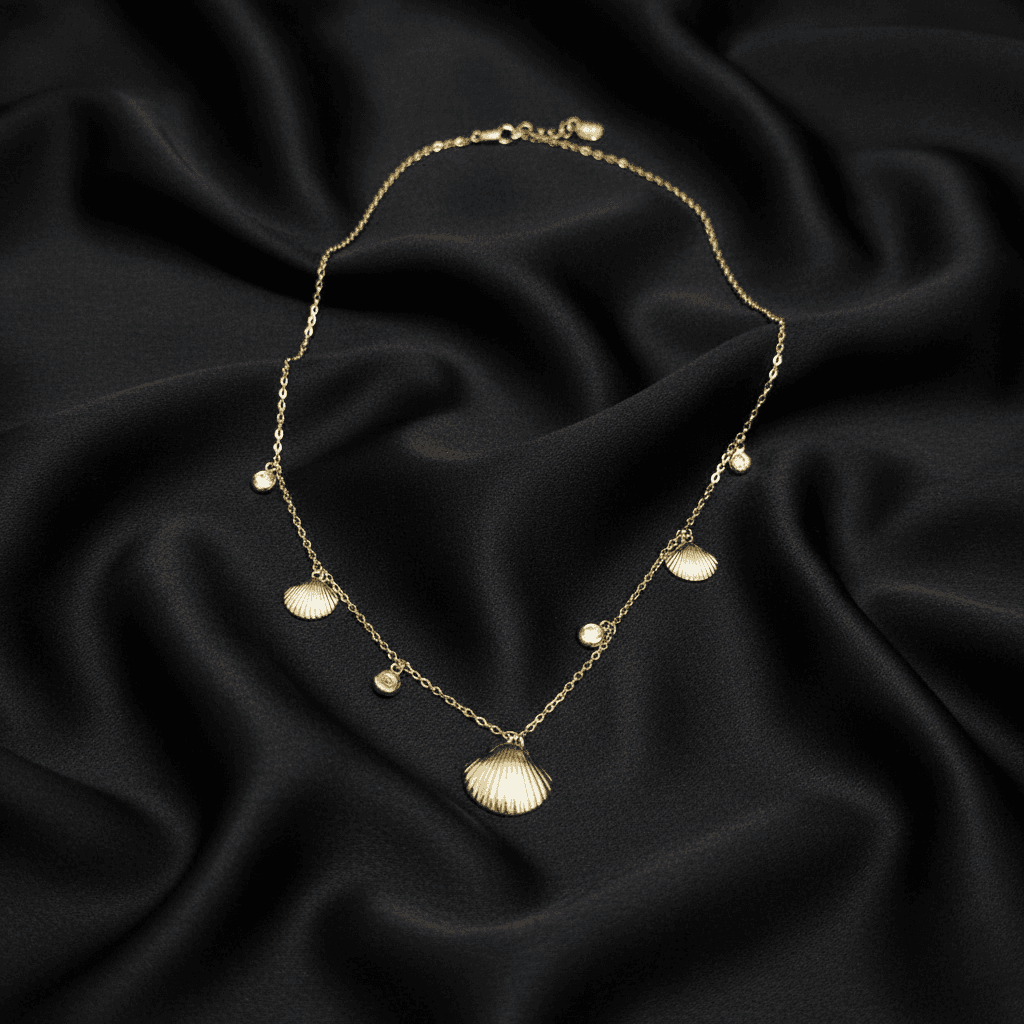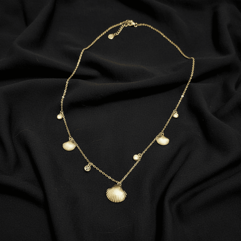 A delicate charm of the shore — this anti-tarnish chain features subtle shell and crystal accents that capture the warmth of coastal sunlight. Lightweight, graceful, and perfect for everyday wear.