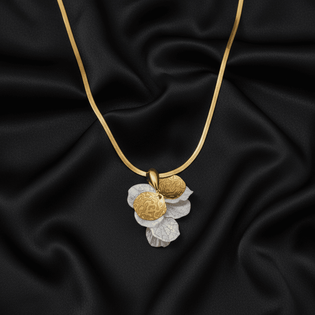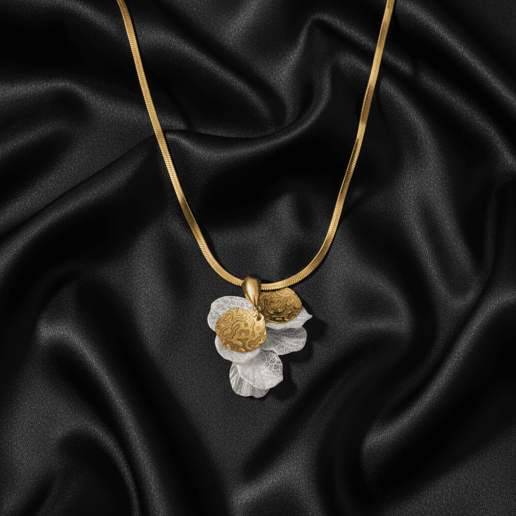 A graceful anti-tarnish chain featuring embossed round medallions paired with delicate leaf accents. Blending nature-inspired charm with modern detailing, it’s perfect for everyday elegance.