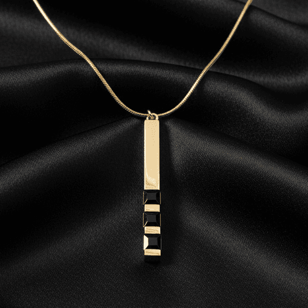 A sleek gold pendant accented with bold black details perfect for adding a touch of modern edge to your style.