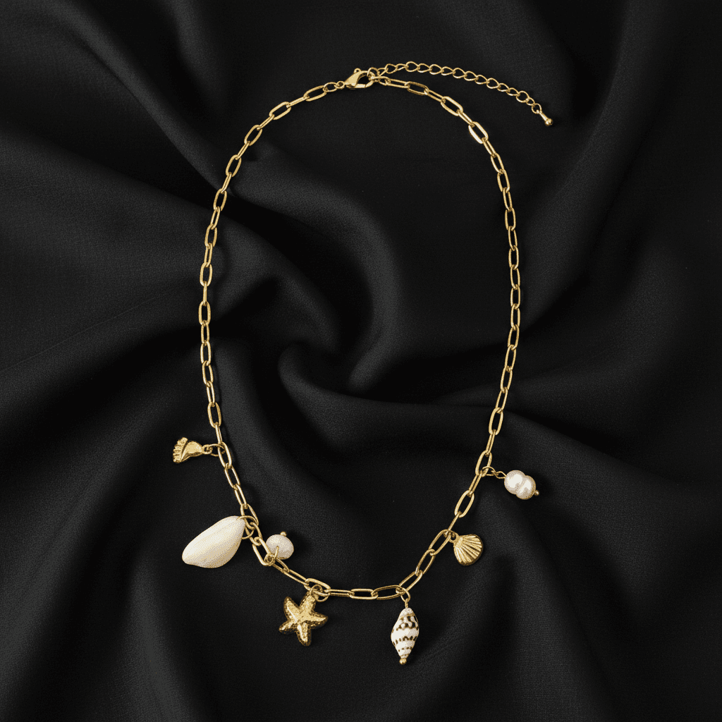 Inspired by the calm beauty of the sea, Ocean Whispers features charming shell and starfish accents on a delicate anti-tarnish chain perfect for effortless coastal vibes.