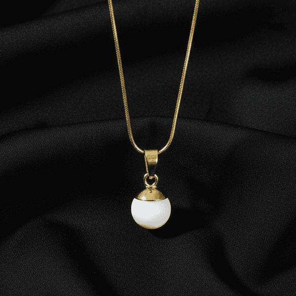 Simple, timeless, and graceful. The Pearl Drop Pendant pairs a white sphere charm with a sleek anti-tarnish gold finish. A minimal statement piece that elevates both everyday and festive looks.