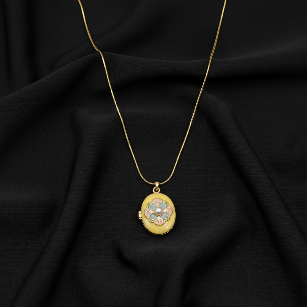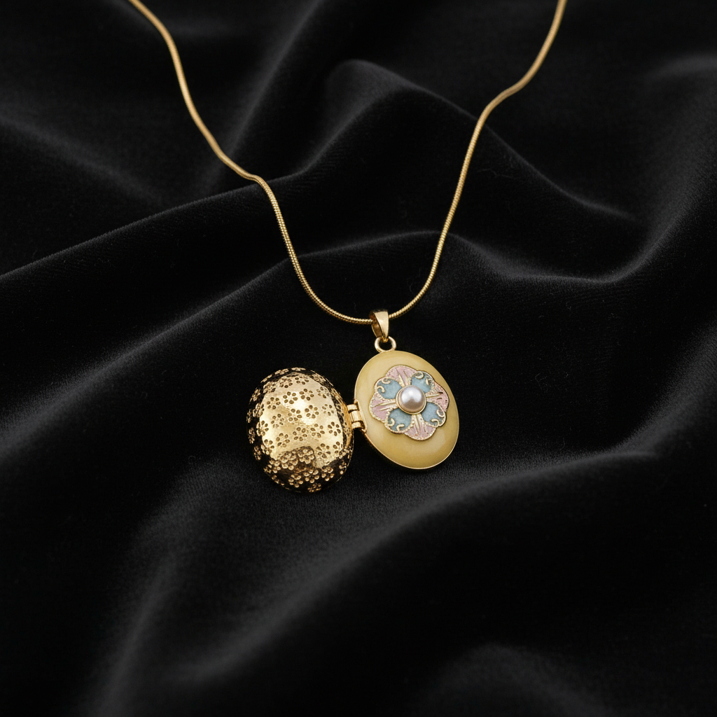 Inspired by timeless Victorian artistry, this anti-tarnish oval locket features intricate filigree detailing and a pastel floral enamel motif crowned with a luminous pearl. A vintage-inspired keepsake designed to hold memories close while radiating heirloom charm.